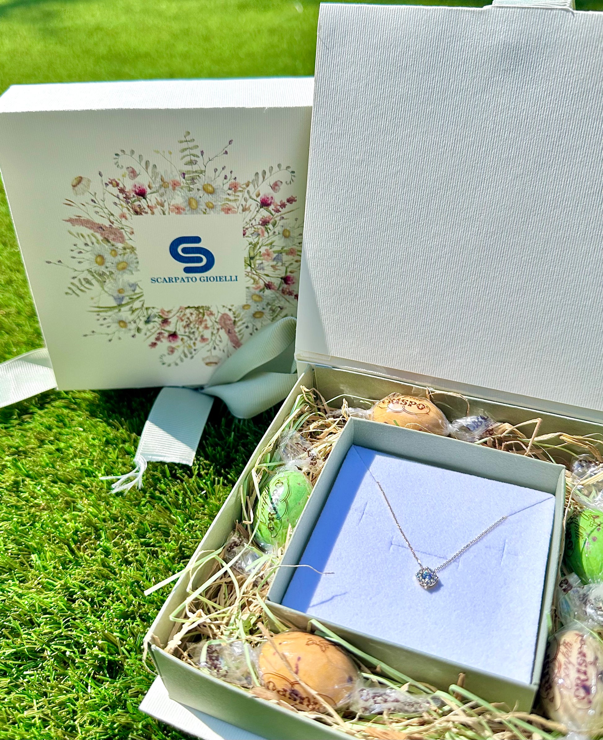 Box Easter Flowers: Cofanetto fantasia floreale, nastro verde salvia. Completo di ovetti di cioccolato fondente confettati e ripieni di creme assortite gusto ricotta e pera, pistacchio, babà e panna, e stracciatella