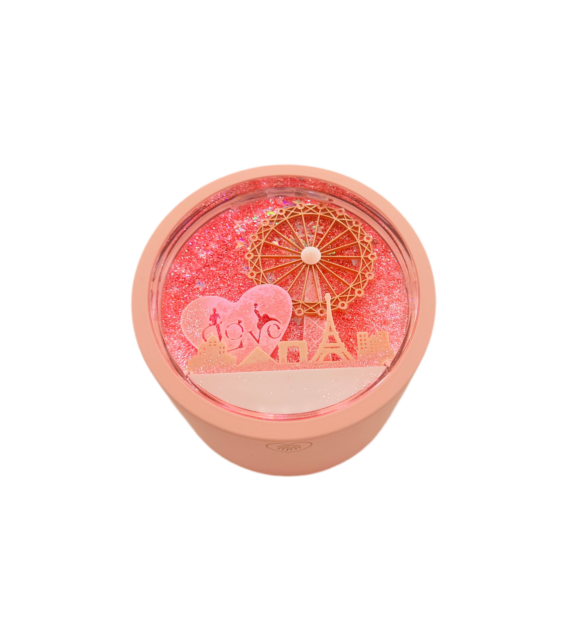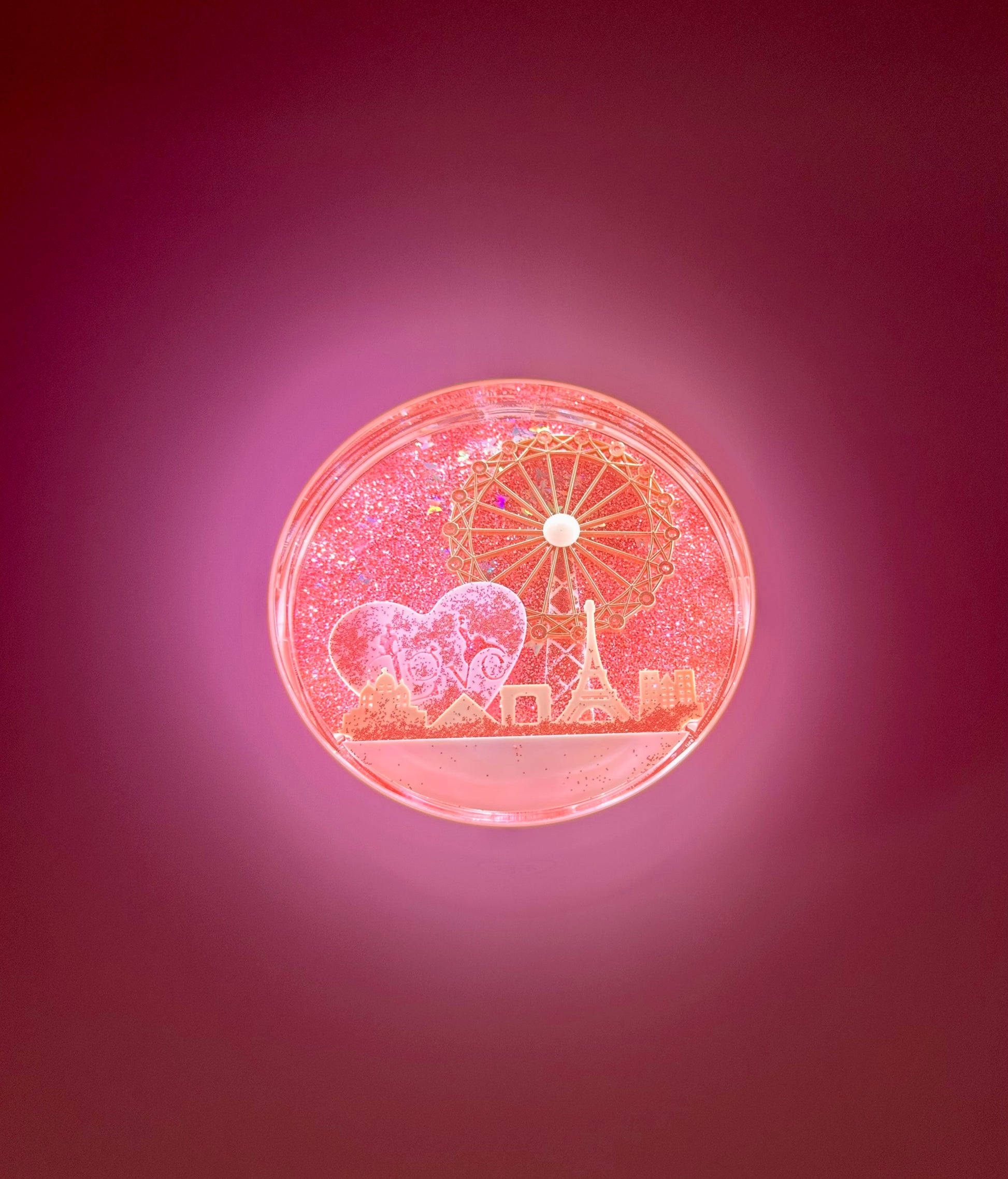 Box La Vie en Rose Luce Led Touch: Cofanetto tondo con luce led touch ed effetto palla di neve glitterata. Colore rosa. Batterie e Shopper incluse.